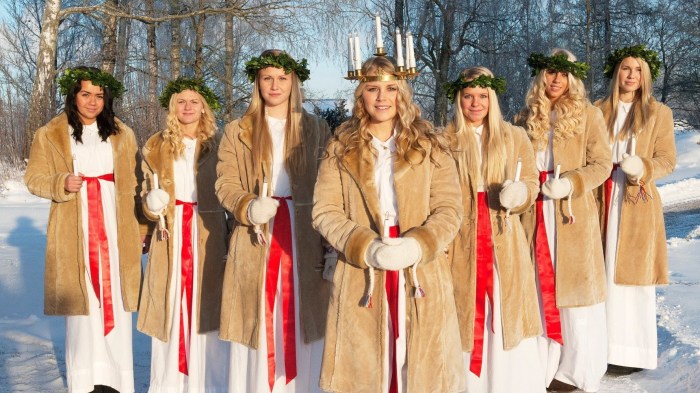This is particularly seen the in Scandinavian countries, with their long dark winters. There, a young girl dressed in a white dress and a red sash (as the symbol of martyrdom) carries palms and wears a crown or wreath of candles on her head. In Sweden, girls dressed as Lucy carry rolls and cookies in procession as songs are sung. It is said in Sweden that to vividly celebrate St. Lucy’s Day will help one live the long winter days with enough light.