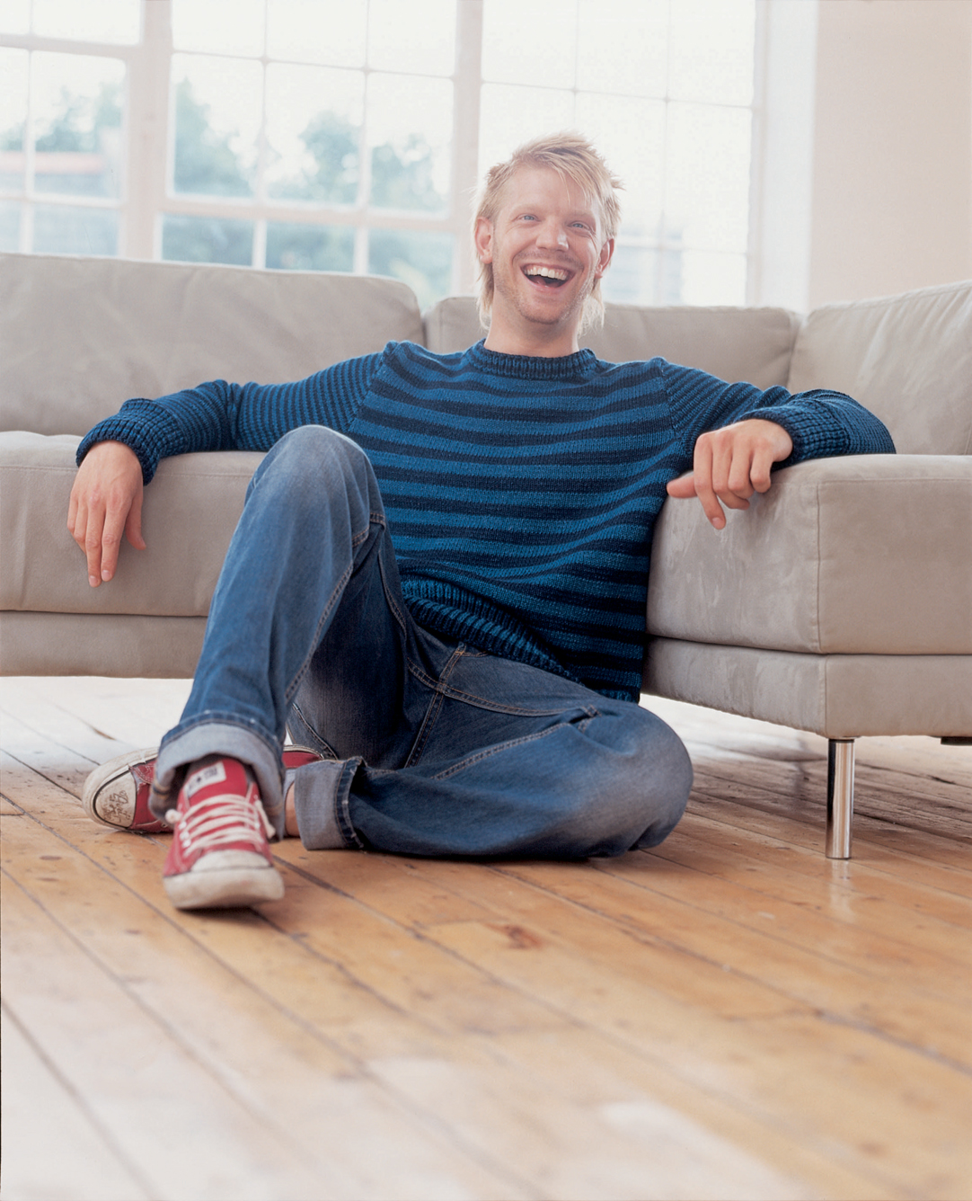 The stripes of this men’s sweater are painted using bleach before washing the garment the first time.