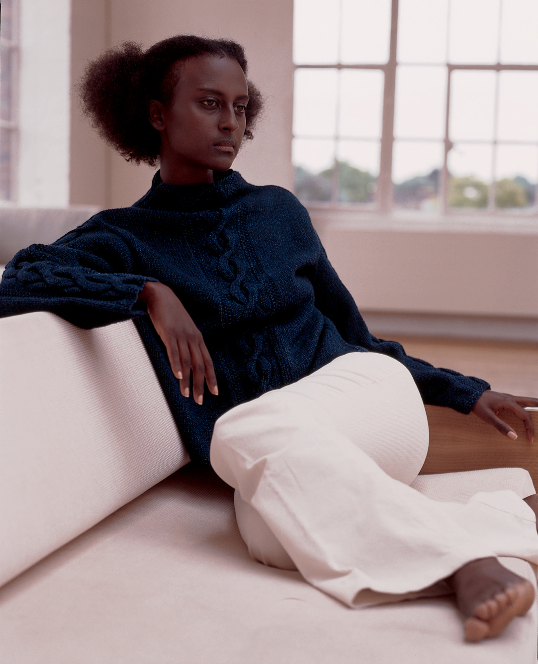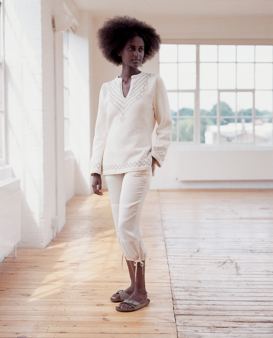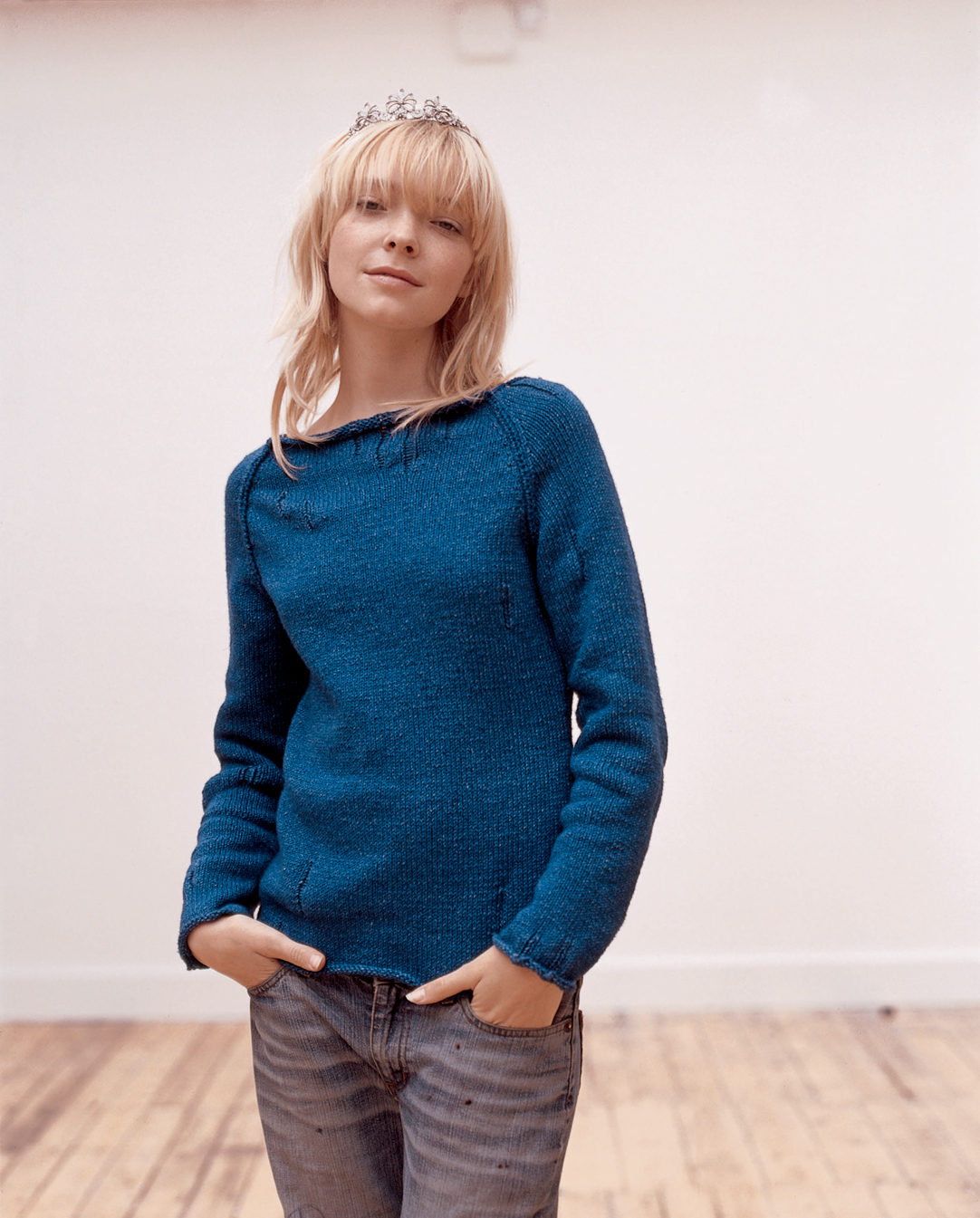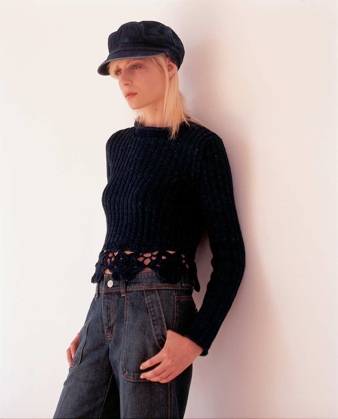 But some words to Rowan Original Denim: This yarn, as with other indigo dyed textiles, fades and ages with washing and wearing. During the dyeing process only the surface of the yarn is dyed leaving the core white. Most of the colour loss takes place during the first wash when all the loose dye is washed out exposing the core. The knitted pieces will also shrink in length during the first wash. Because the dye is only a surface dye, during knitting the colour will come of tho your hands. This will wash off very easily but it is advisable to protect your clothing or wear something dark.