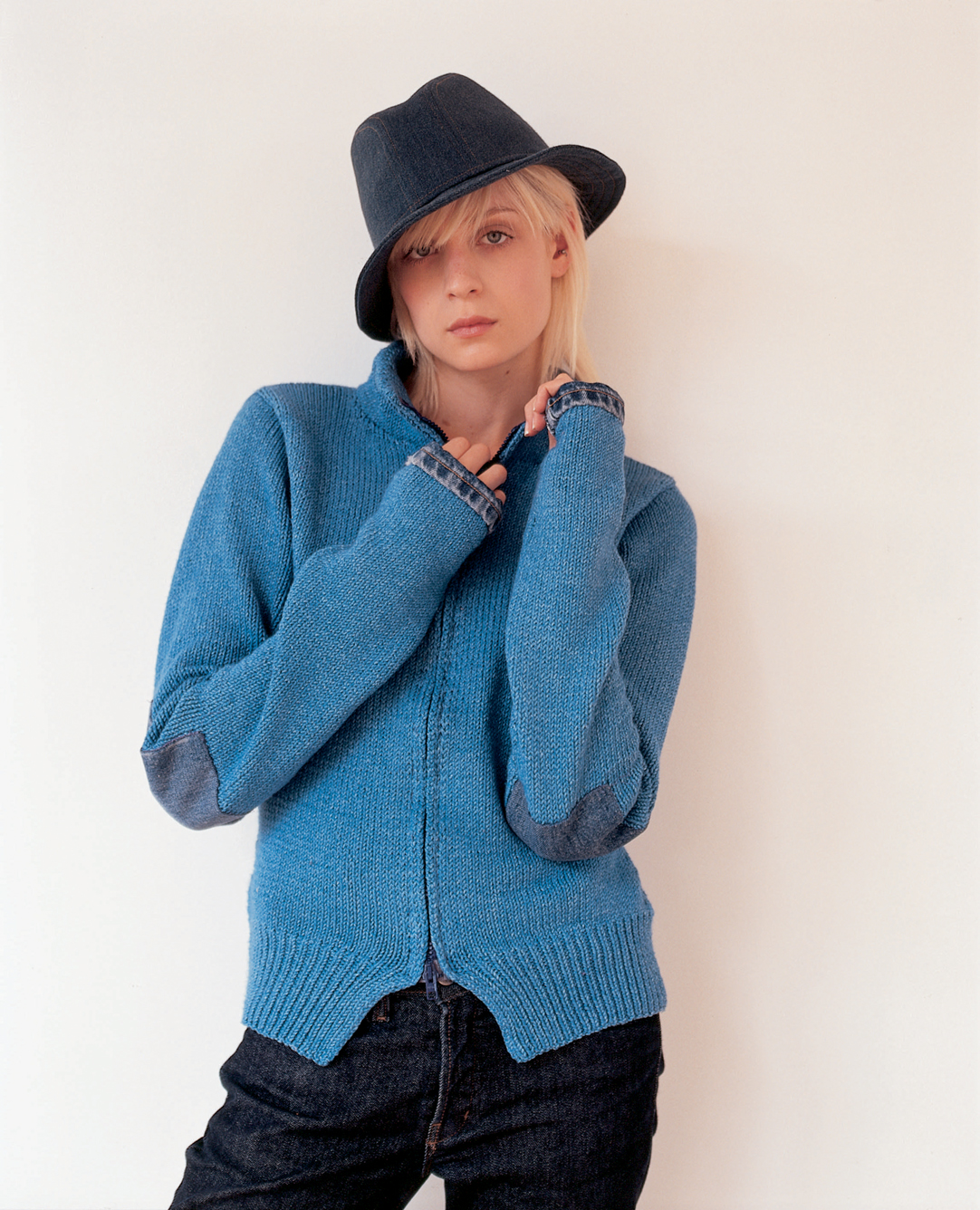 This cardigan is featuring a zipper closure and elbow patches cut out from old blue jeans.