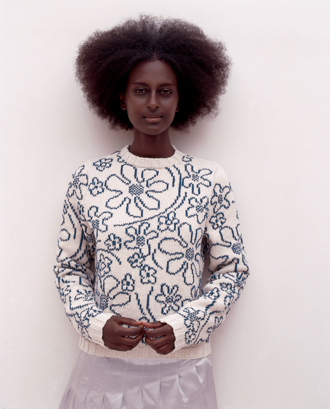 This sweater is knitted using the intarsia technique and is featuring a floral pattern.