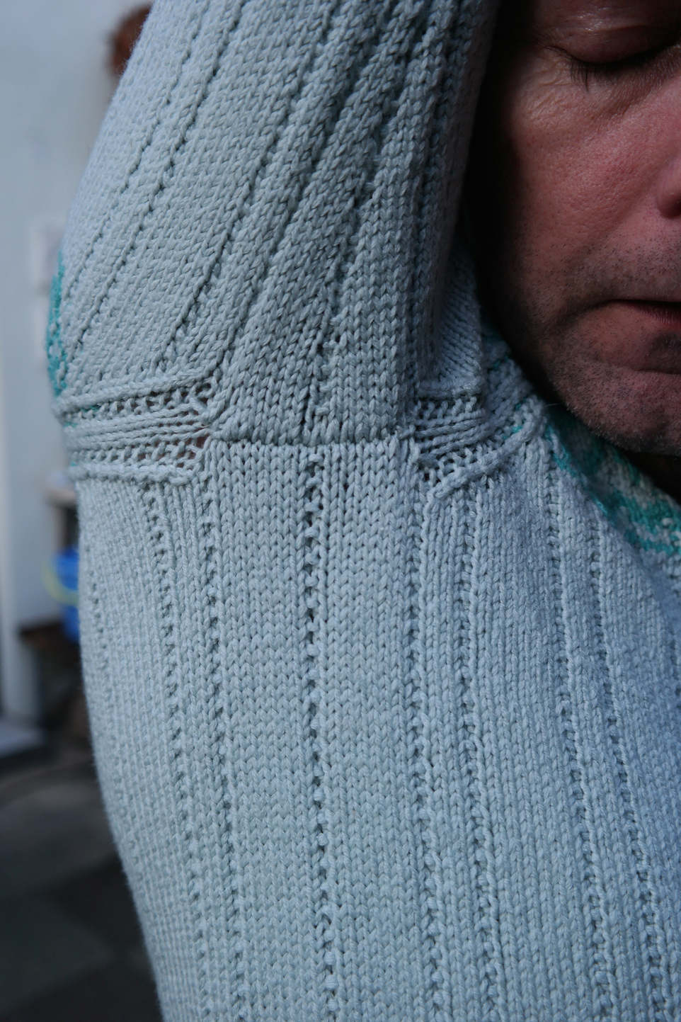 The sleeves are also knitted in the round and joined to the body using a 3-needle-bind-off.