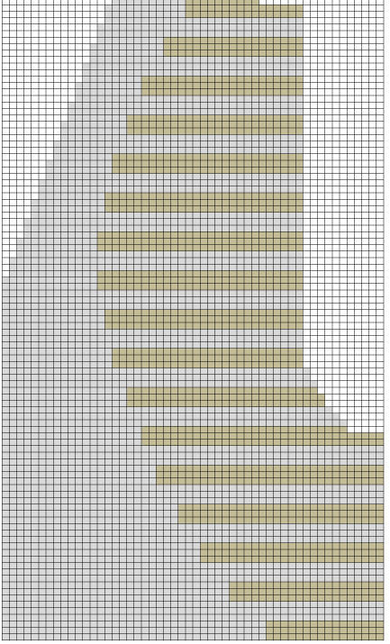 In our example: 42 rows : 18 stitches = 2,3 rows. This means every 2,33 row you have to decrease a stitch to form the neckline. Wait a minute, we all know, you are not able to knit 2,33 rows! So you have to decide how want to arrange the decreases.