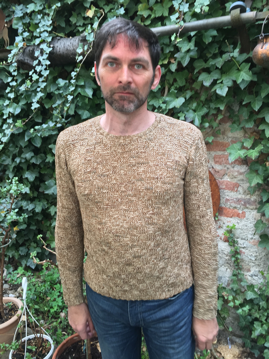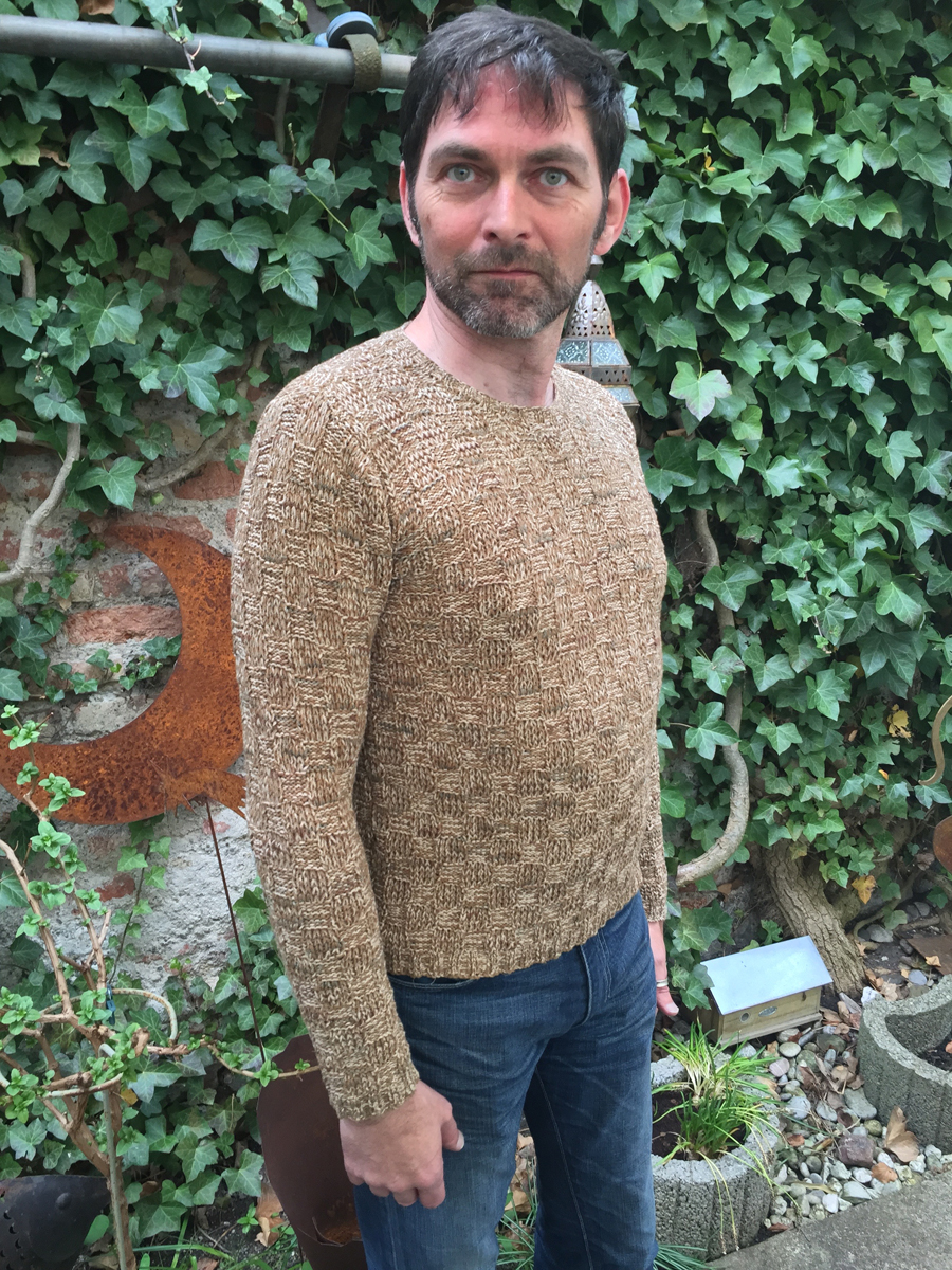 Oolong by Lisa Richardson is a men’s sweater showing a check style pattern with elongated stitches. It is featuring set-in-sleeves and a round neck.