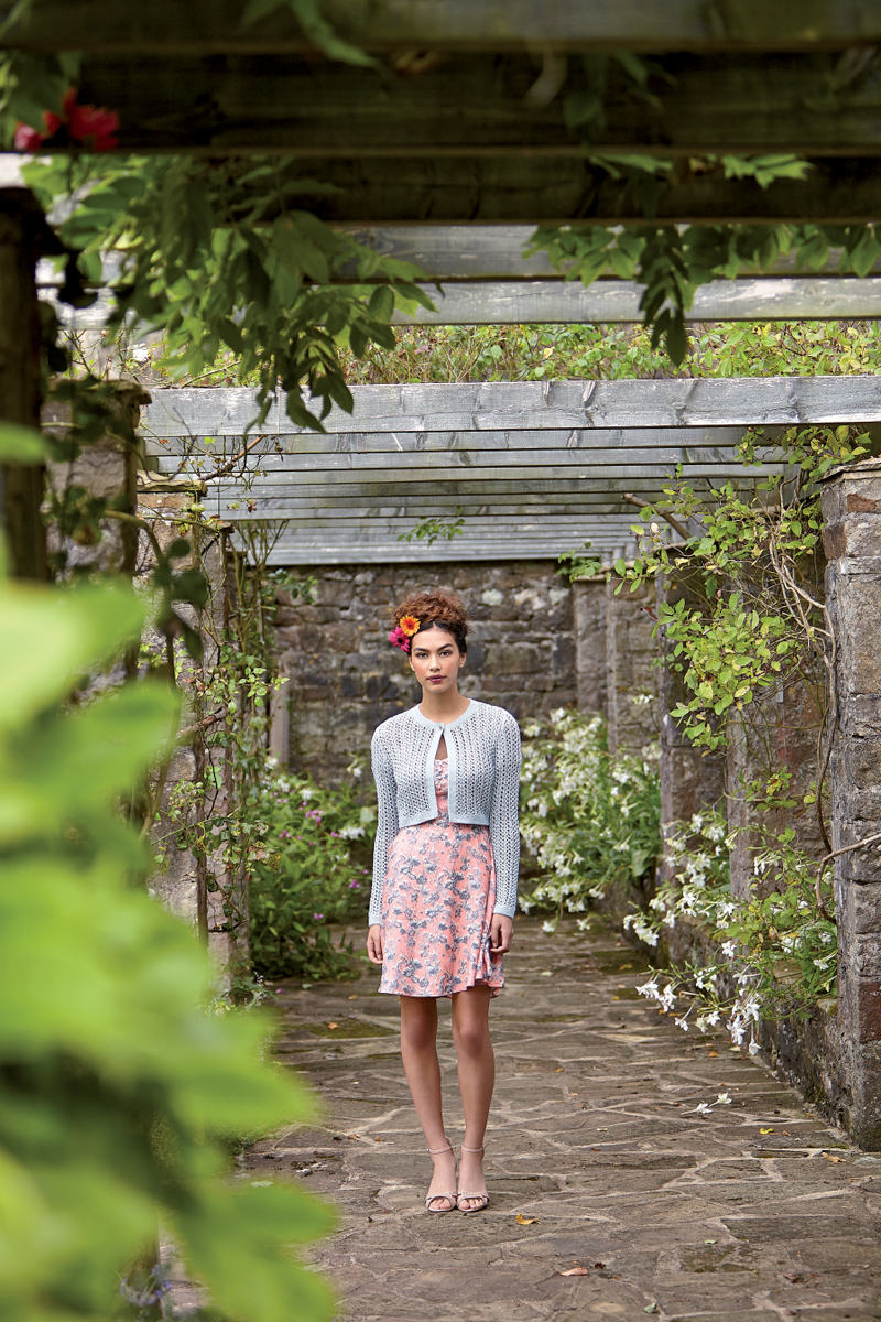 Hellebore is a lovely wrap-over cardigan. It is featuring an all-over lace pattern chaperoned with tiny bobbles and capped sleeves.