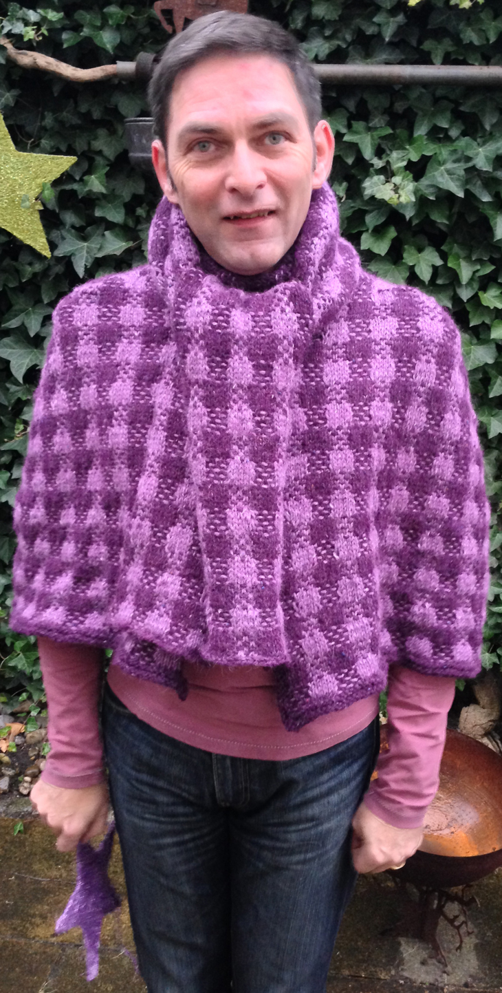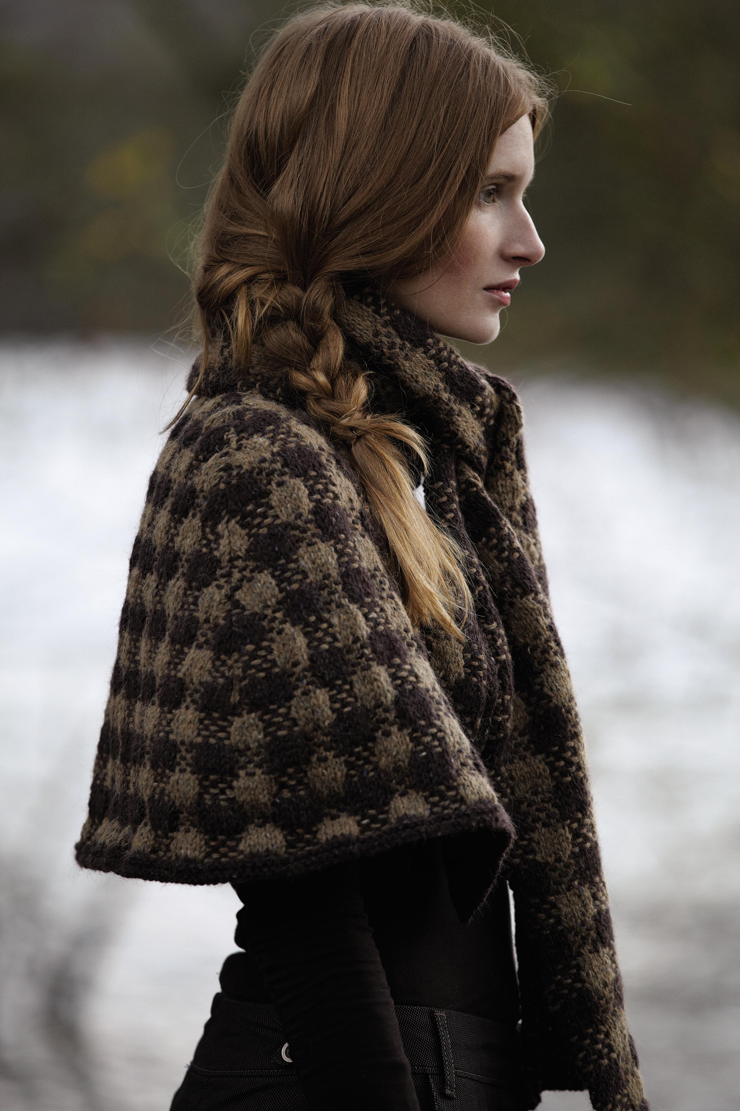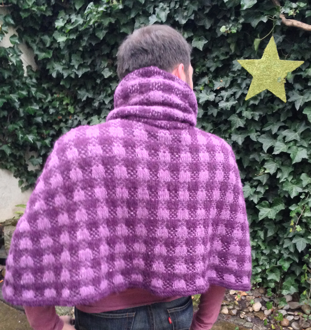 This cape is knitted using Rowan Felted Tweed Aran. The pattern is formed using slipped stitches and it is knitted in two parts. The main part forms the cape and the shawl is separately knitted and attached to the neck.