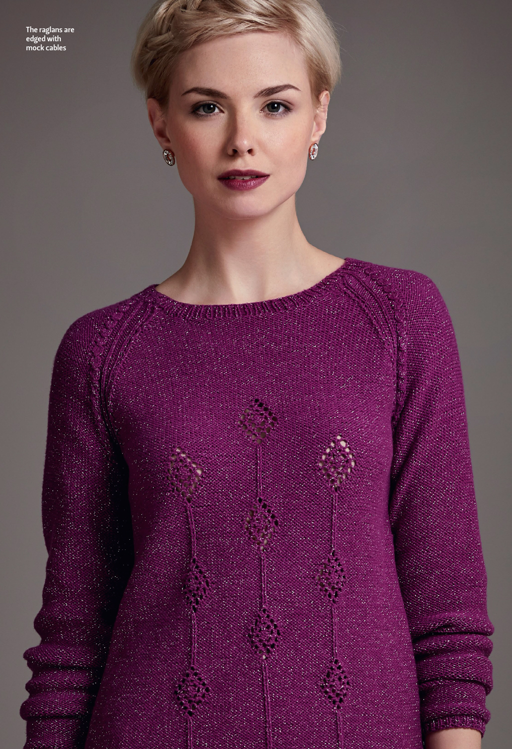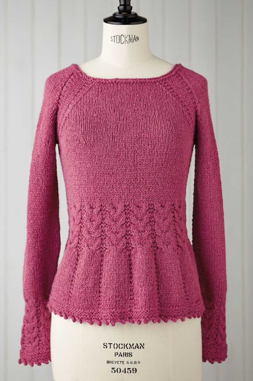 This top by Sarah Hatton shows an airy lace pattern on the lower body and the yoke. This garment is knitted in two pieces with knitted-on sleeves. It is shown here in Rowan Handknit Cotton (Heavy DK/worsted weight; 100% cotton)
