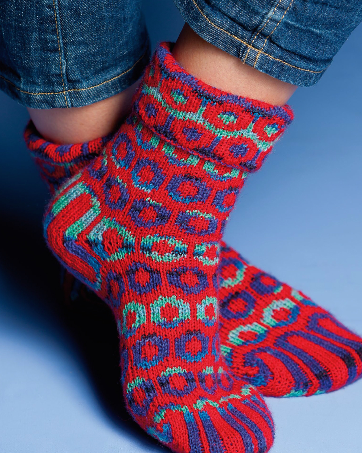 Knitable in 3 sizes to fit foot circumference from 20cm (8″) to 25cm (9¾”).