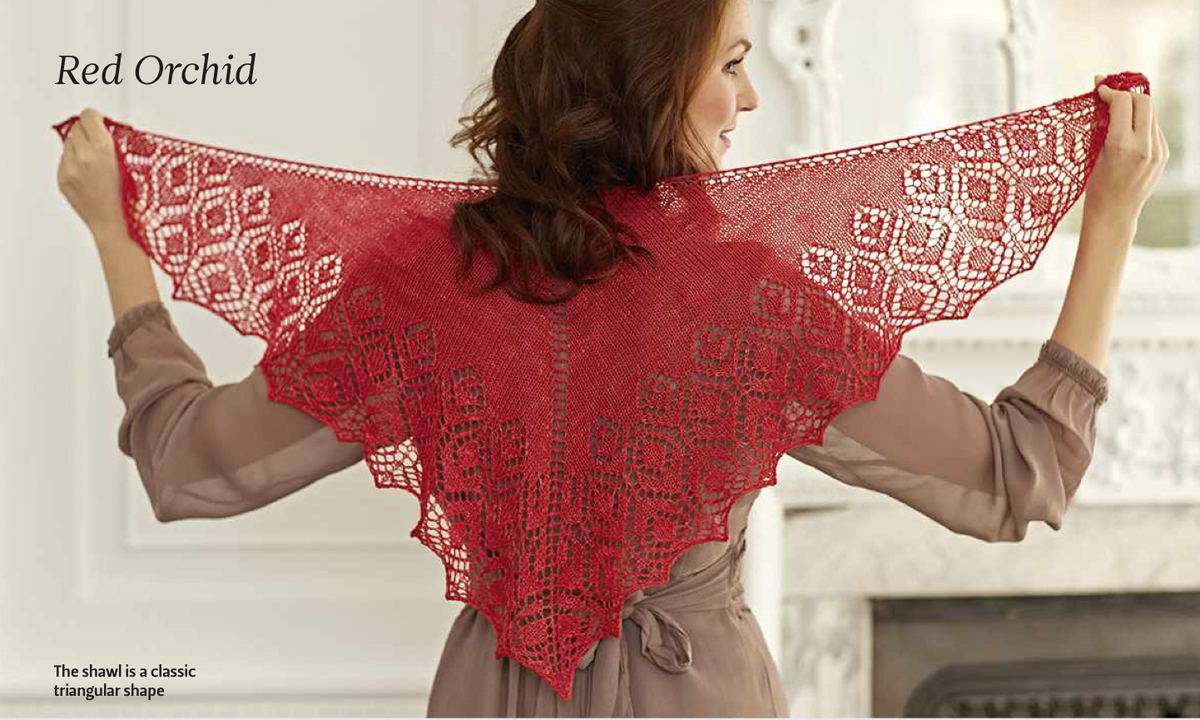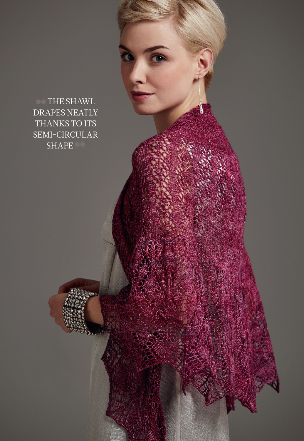Mary Henderson designed this lovely lace wrap in Jamieson’s of Shetland’s Shetland Spindrift (DK weight, 100% Shetland wool). Starting with a provisional cast-on this wrap is knitted flat. The second lace border is knitted from the provisional cast-on to finish this wrap.