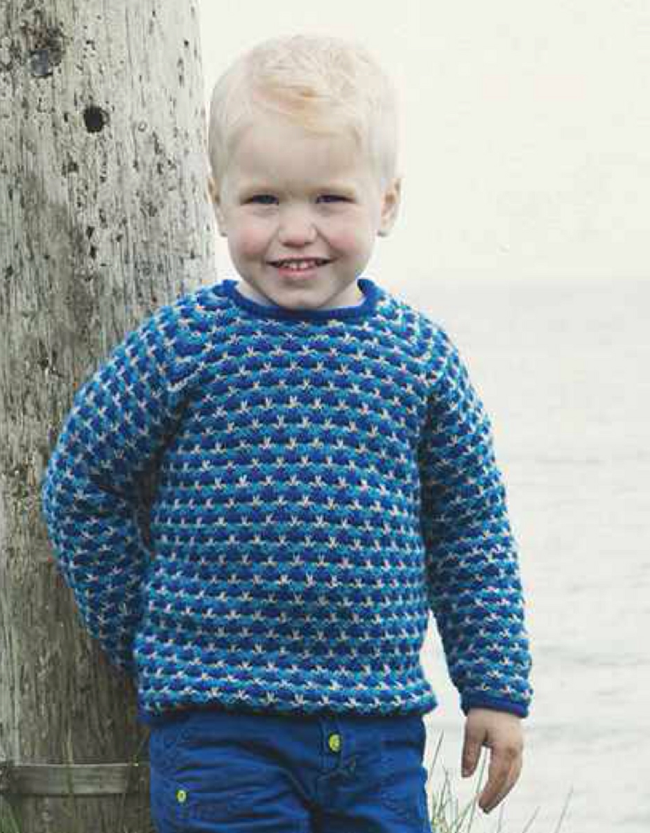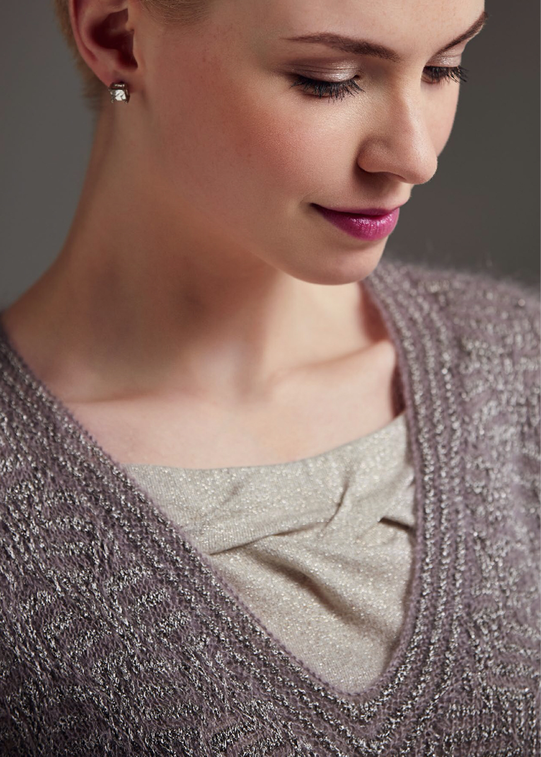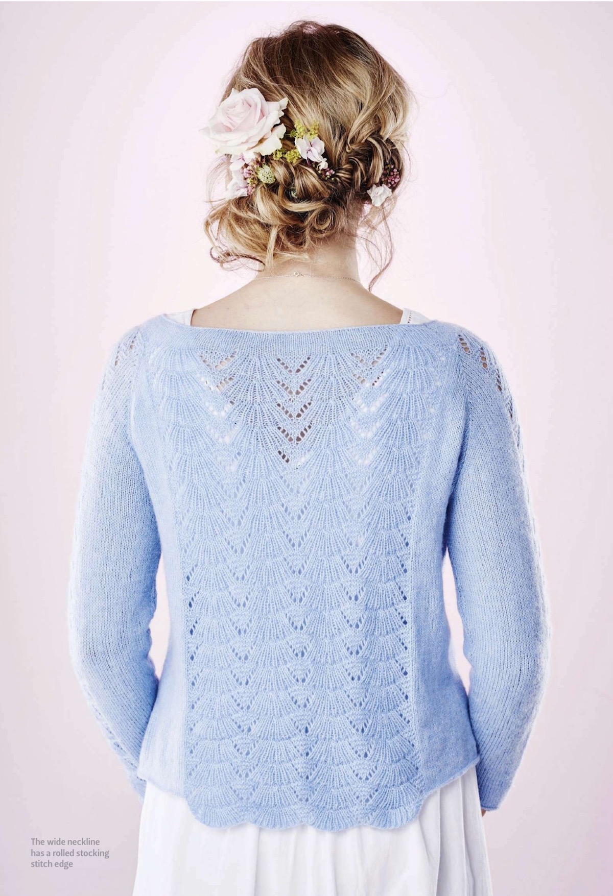 Moira Williams has designed this light-weight jumper with panels of lace flowing down on the center of back, front and the sleeves. The pattern itself is creating the shell-like edging. Shown here in Cashmered 3ply (3ply weight; 100% cashmere)