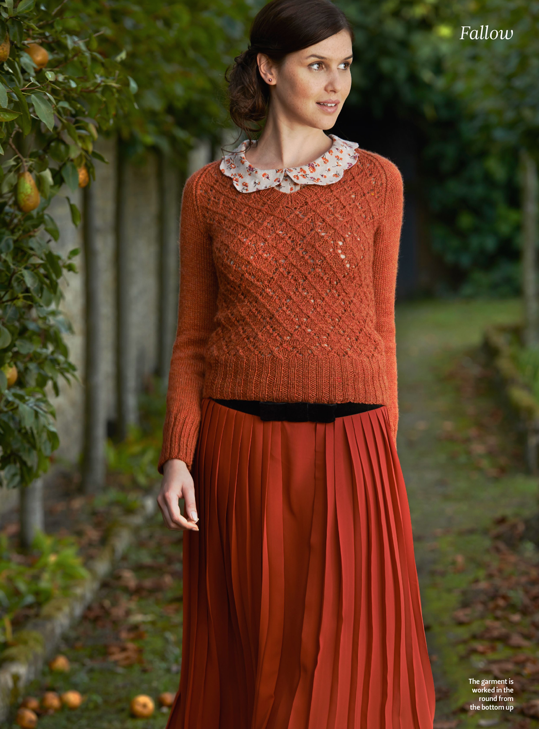 Sarah Hatton created this cropped sweater with a vintage touch. An all-over lace pattern is shown on both front and back, whereas the sleeves are knitted in plain stockinette-stitch. The edgings are knitted in moss-stitch. Shown here in Rowan Wool Cotton 4Ply (4ply weight; 50% cotton, 50% Merino wool).