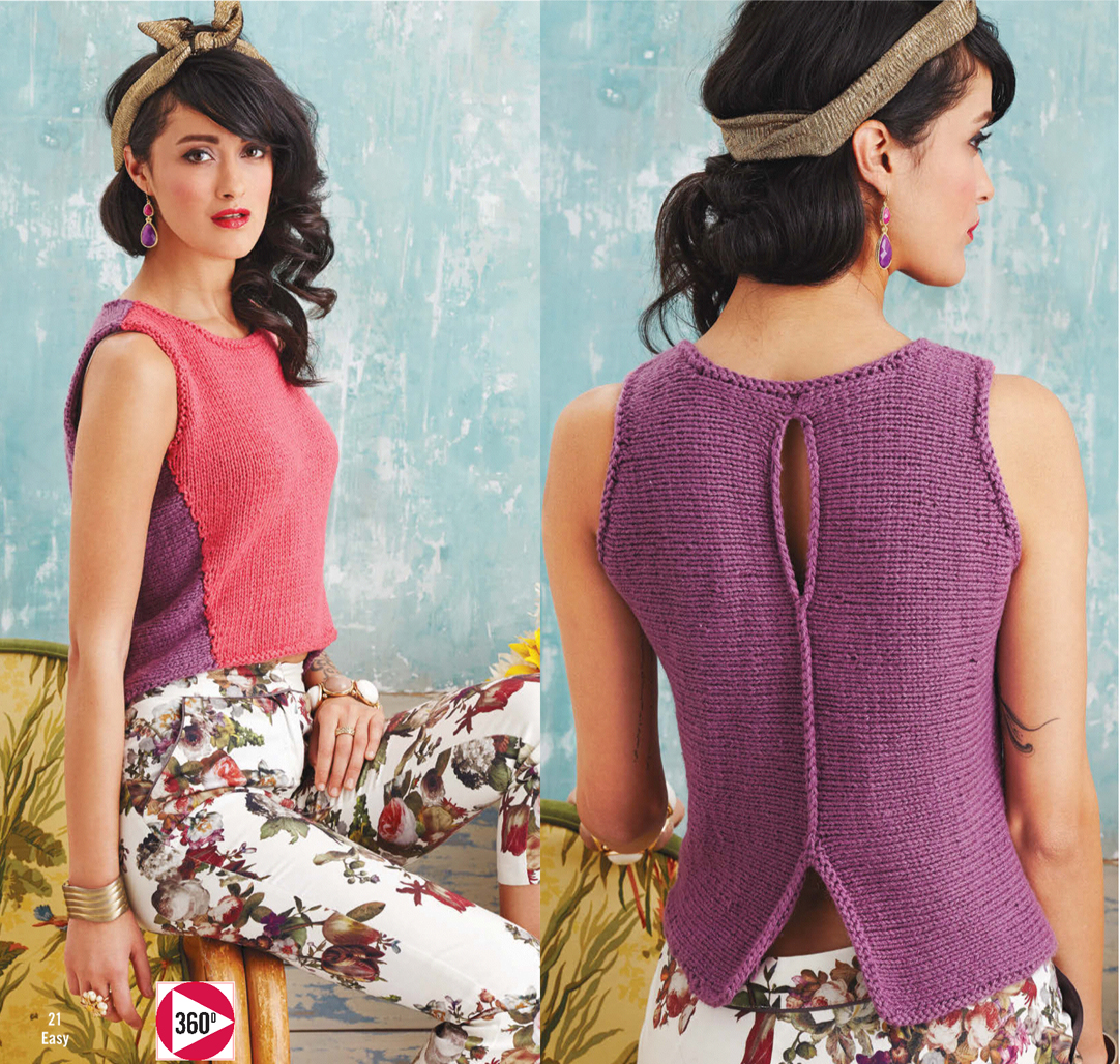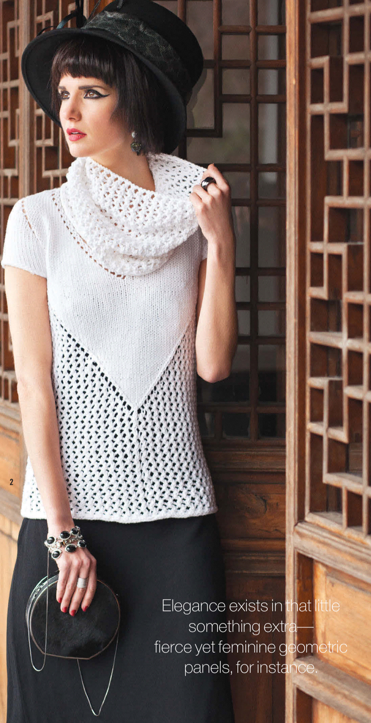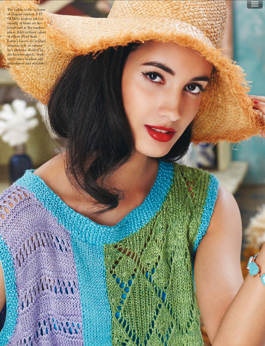Another eye-catcher is this loose-fitting vest by Theresa Schabes, which is worked in two pieces in twisted rib. Shown here in Lustra (50% wool, 50% tencel/lyocell) from Berroco.