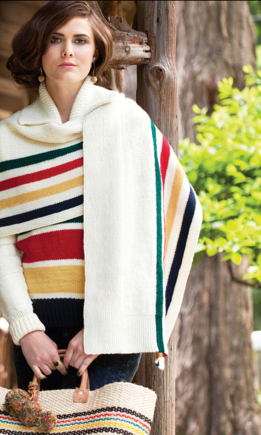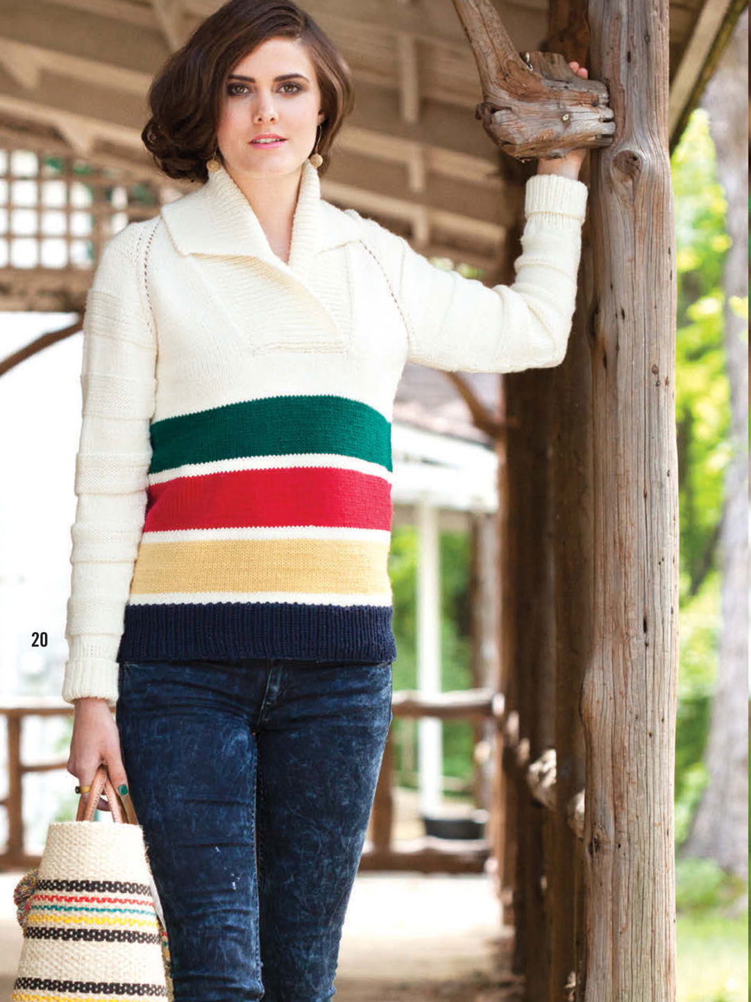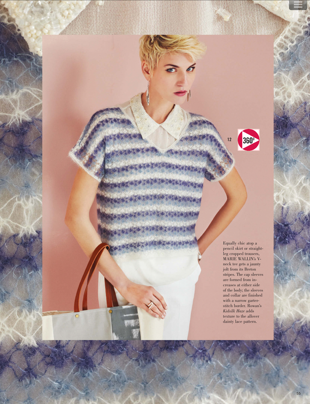 This loose-fitting pullover is knit from the top down in alternating colour and rib stripes with an eyelet detail on the raglan sleeves. It is shown here in Llamalini (40% Royal Lama, 35% silk bourette, 25% linen) and Bamboo Bloom Handprints (48% rayon, 44% wool, 8% acrylic), both from Universal Yarn.