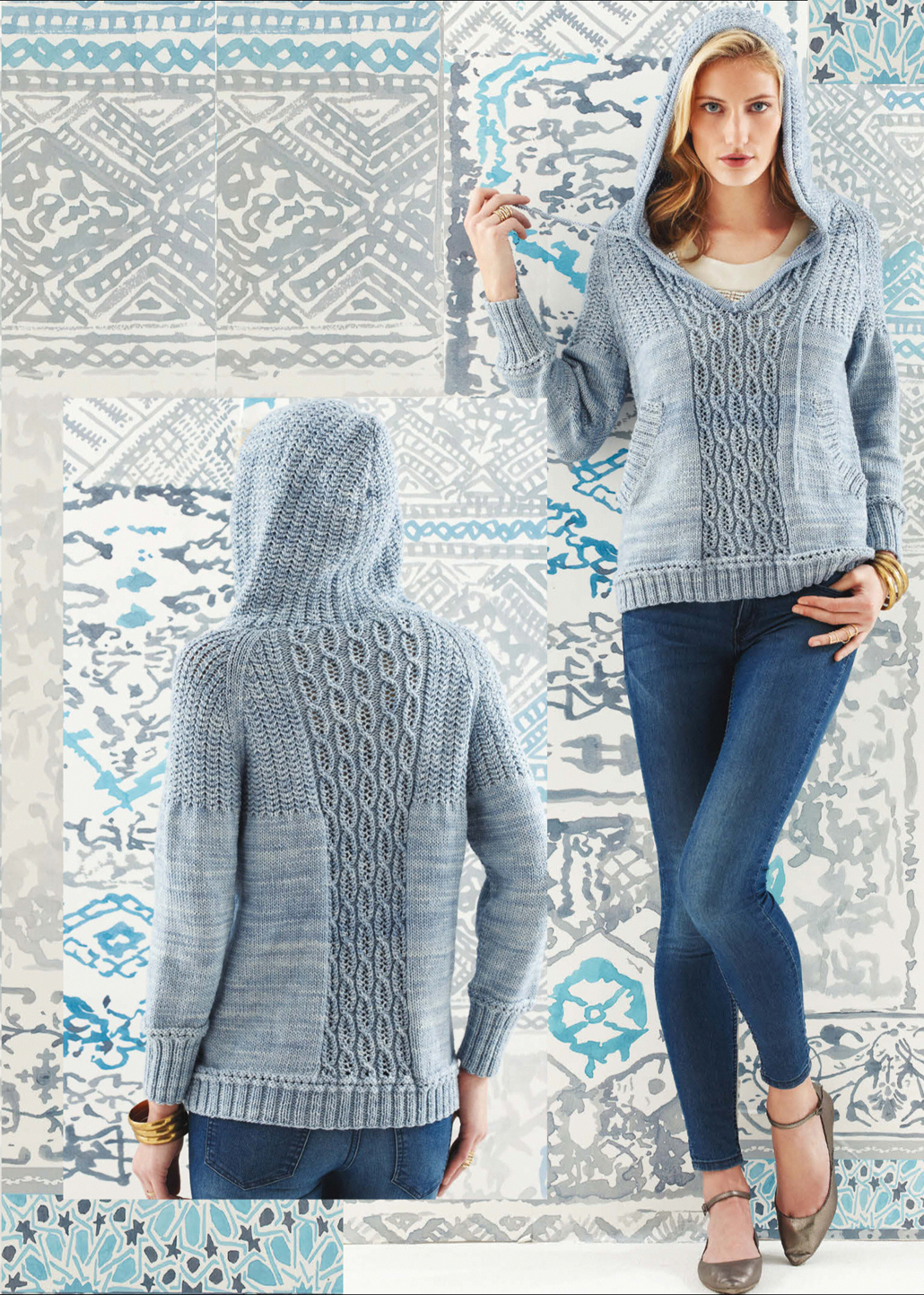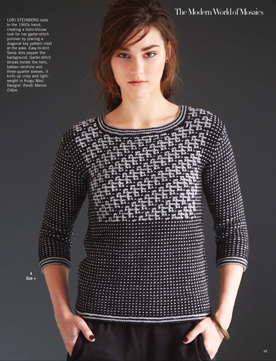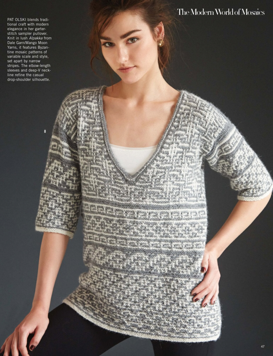 The mosaic yoke of this oversized kimono-style pullover is worked from provisional cast-on at lower edge of yoke to the shoulders, then the solid body is worked from provisional cast-on to lower edge. Shown here in Bergère de France’s Pur Merinos Français (100% Arles Merino wool) yarn.