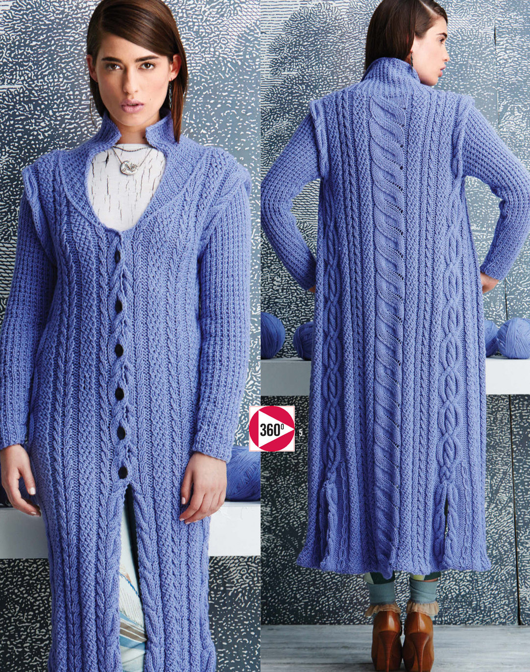 This oversized tunic pullover with large pleat twisted cables separated by garter rigged panels by Deborah Newton is knitable in 4 sizes from bust 46″/117cm to 56″/142cm.