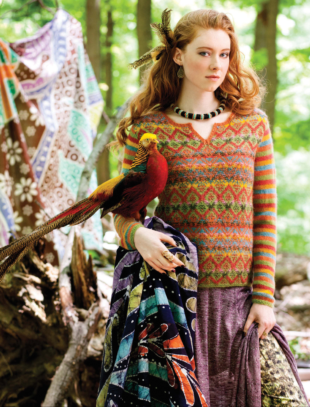 This standard-fitting pullover by Amy Micallef is knitted in the round to the underarm, then front and back are worked flat to the shoulder. with multiple two-color motifs. Shown here in Imperial Yarn’s Tracie Too (100% wool) yarn.
