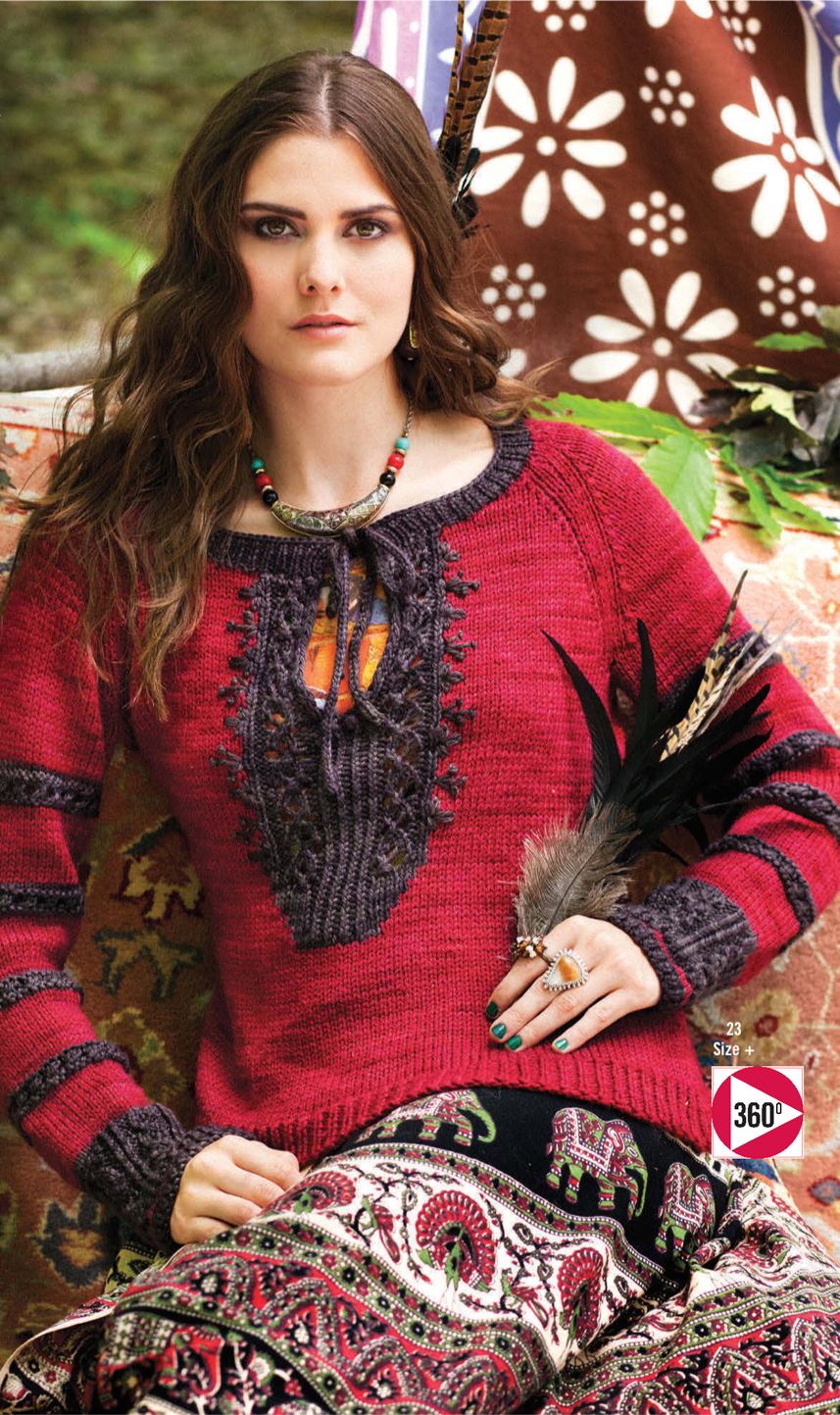 Laura Zukaite’s Arrowhead Top is shown here in Cascade 220 (100% wool) from Cascade Yarns. This standard-fitting top with central slant ribs that form the center points and attached sleeves that form the circular yoke is really lovely.