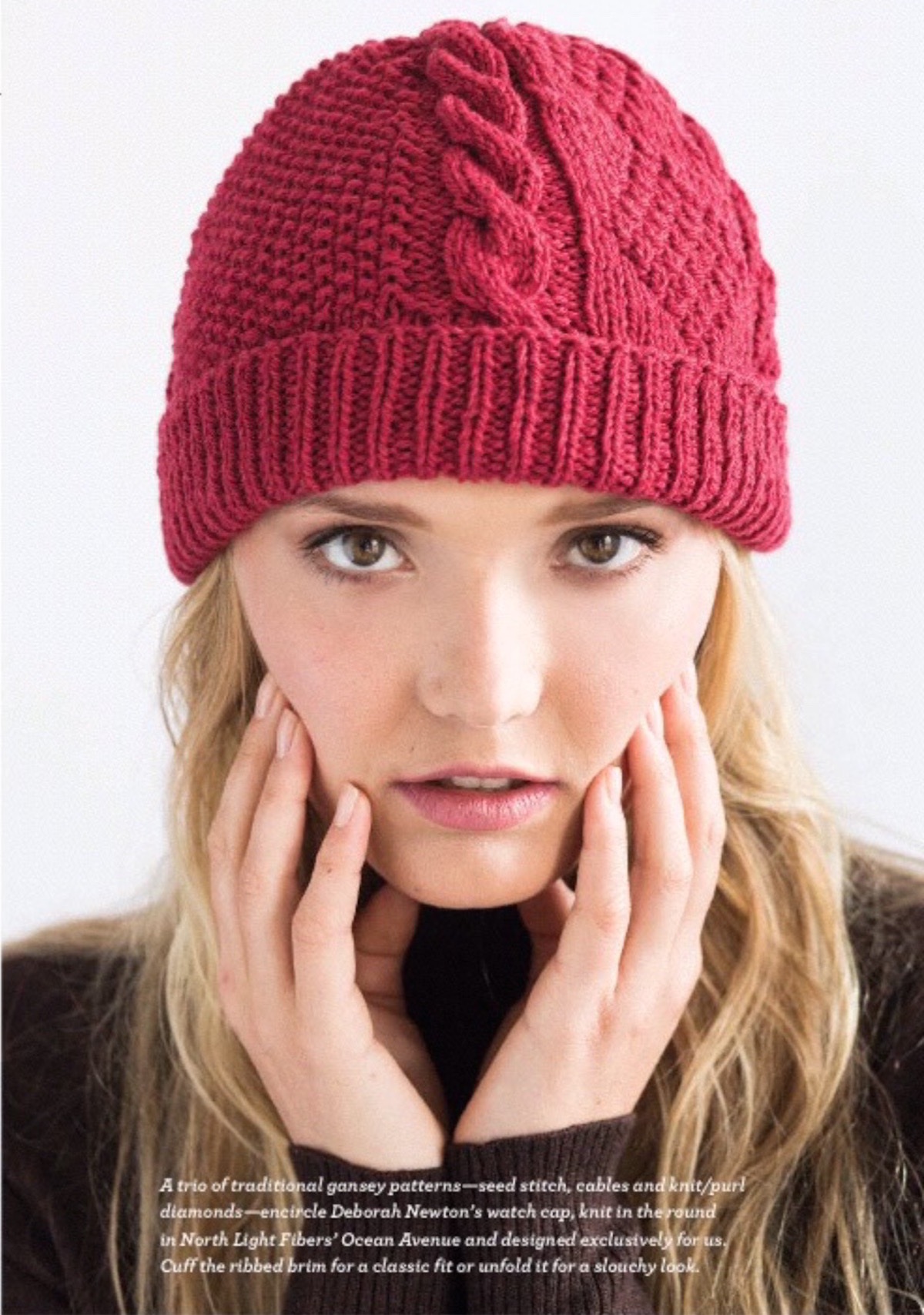 This hat by Deborah Newton is showing different gansey patterns and is knitted in the round. It is shown here in Ocean Avenue from North Light Fibres.